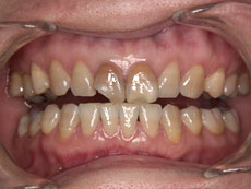 前歯2本はかなり昔に神経を取ってしまったために強度に変色しています。